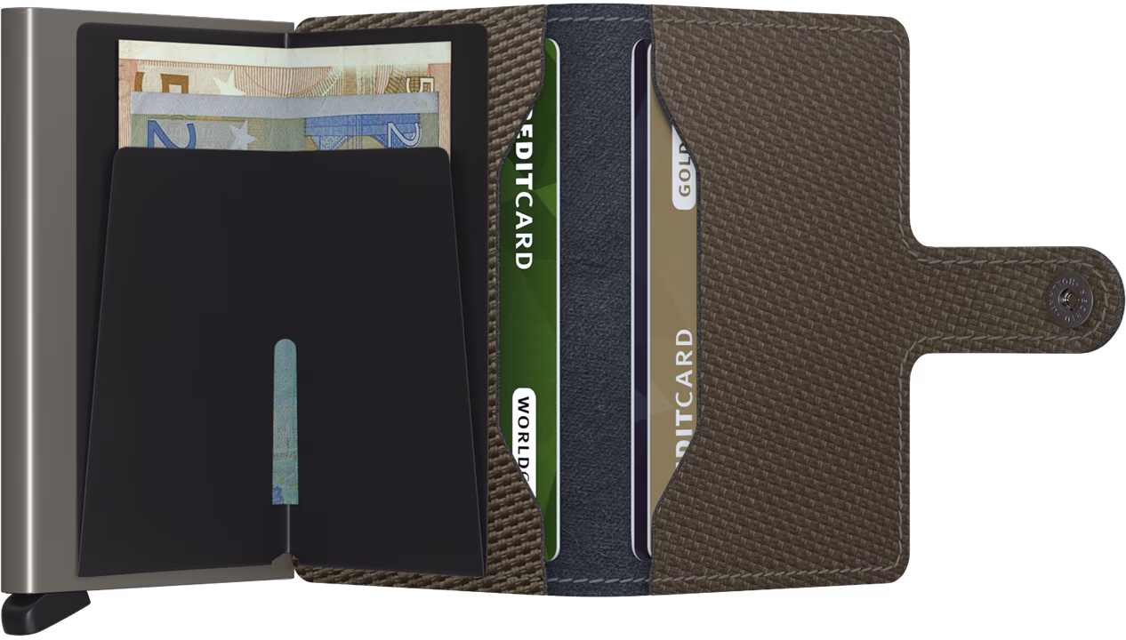 Das Miniwallet ist klein und doch überraschend groß, es kombiniert das Beste aus beiden Welten. Während sich auf der einen Seite Banknoten, Quittungen und Karten, leicht verstauen lassen, können Sie auf der anderen Seite mit dem Aluminium Cardprotector Ihre Karten mit einer einfachen Bewegung herausschieben. Außerdem sind Ihre Karten vor Biegen, Brechen und vor unerwünschter drahtloser Kommunikation geschützt.